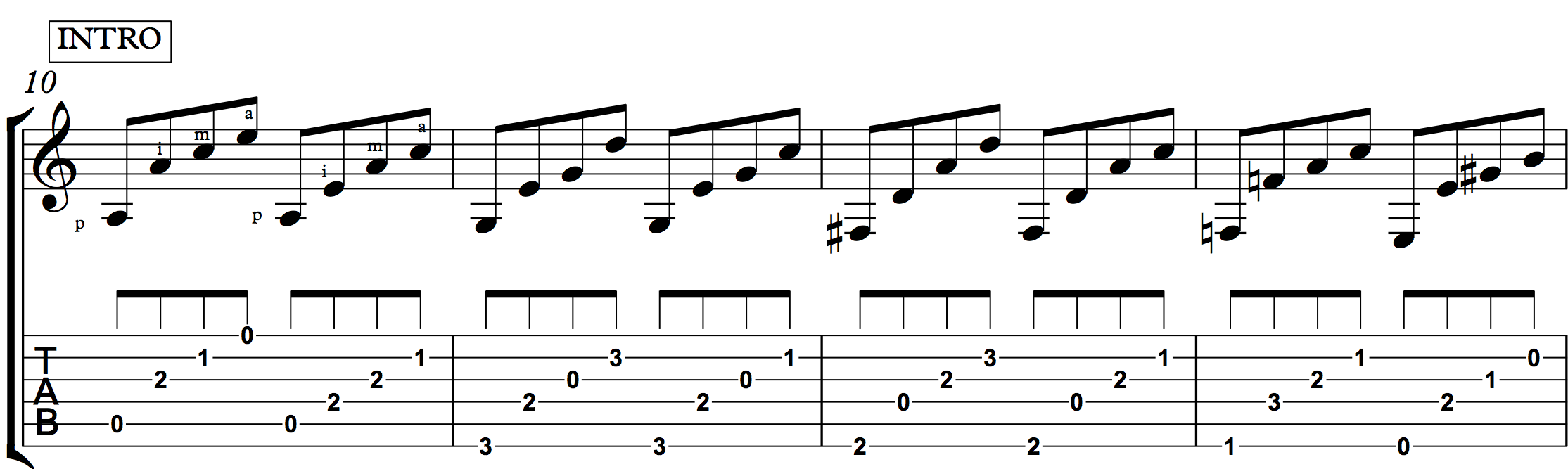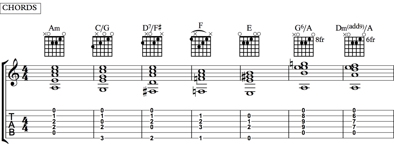 Una volta assimilato l’arpeggio-base, proviamo ad aggiungere gli altri accordi. Come vedrai, Page abbellisce gli accordi con qualche addizione, il che rende molto personale il suo arpeggio. Di seguito ti riporto la trascrizione di intro e verse del brano.