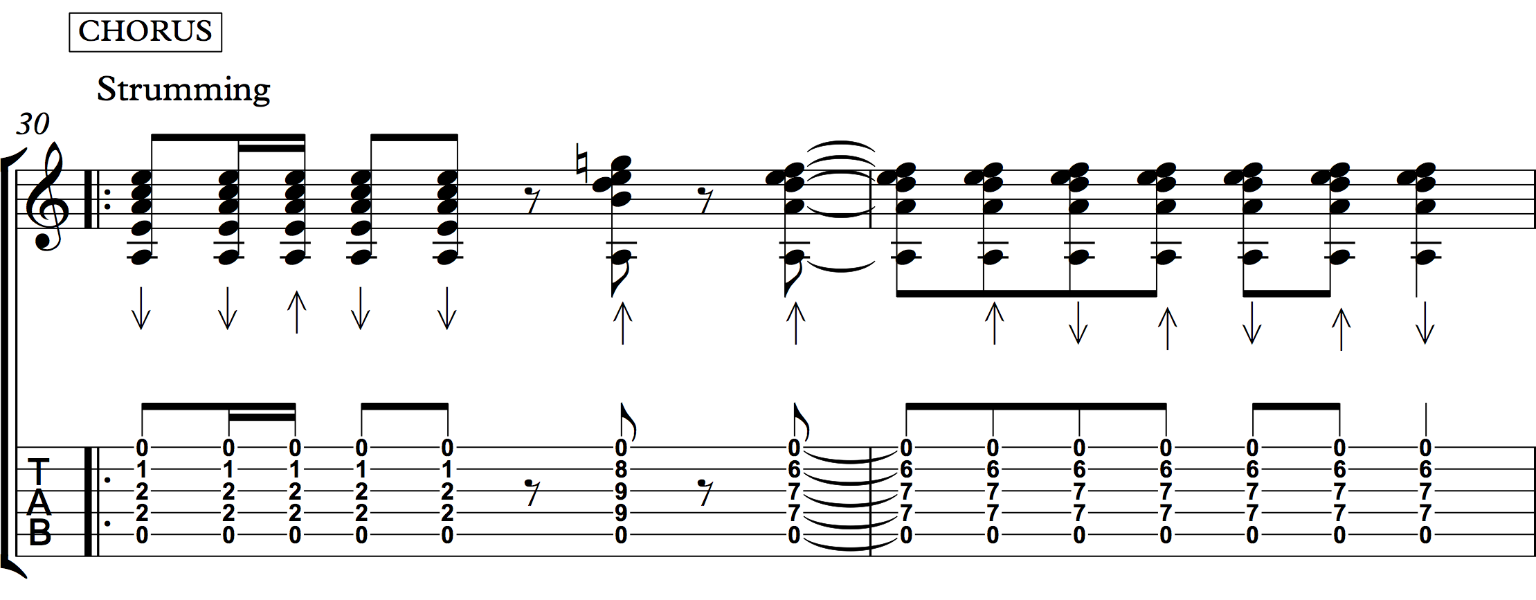 Arrivati al Chorus, abbiamo questo pattern strumming, in cui Jimmy page fa “scivolare” la posizione di Lam prima al nono tasto (ottenendo un G6/A), e poi al settimo tasto (ottenendo un Dmadd9/A). Puoi eseguire questo pattern di strumming sia col plettro che con le dita: in entrambi i casi, ti ho indicato la direzione delle pennate con delle frecce.