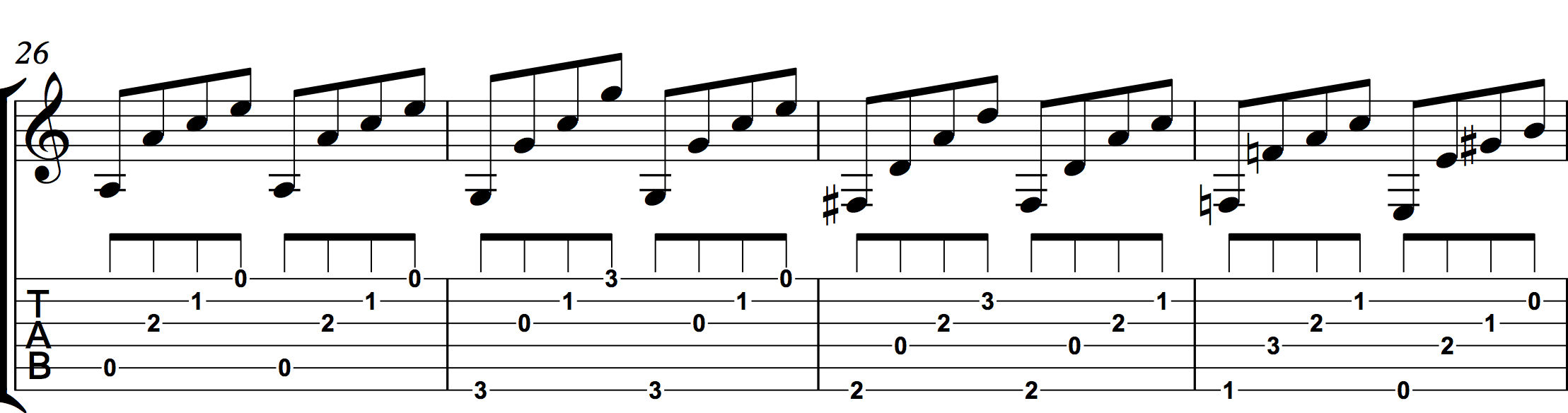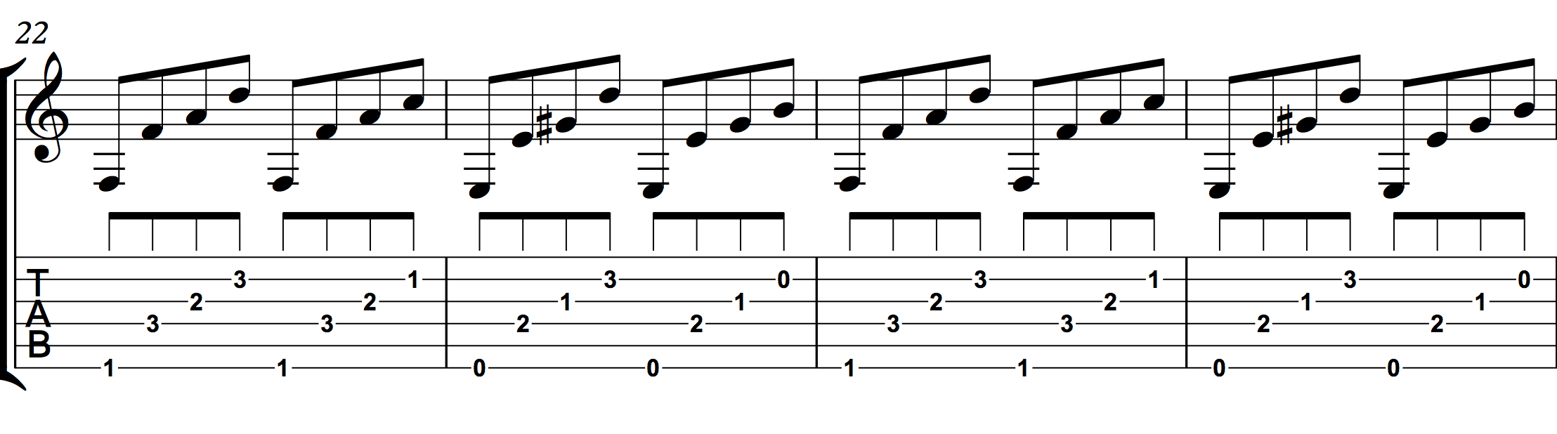 Suggerimento pratico: Prima di affrontare l’arpeggio vero e proprio, è importante riuscire a cambiare fluidamente questi accordi mantenendo il tempo. Nel VIDEO ti mostrerò come esercitarti al meglio su questi cambi rapidi).