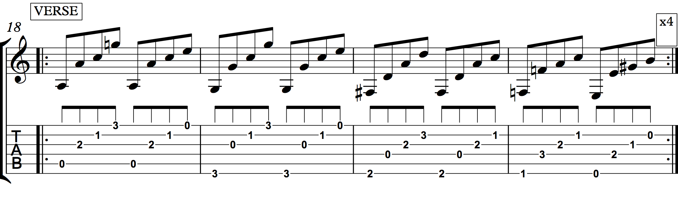 Consiglio pratico: Parti studiando il pattern di arpeggio solo sull’accordo di Am che trovi qui sotto. Procedi lentamente, concentrandoti sulla pulizia del suono e sulla dinamica. Ti consiglio di accentare la prima e l’ultima nota di ogni quartina per dare musicalità all’esecuzione, proprio come Page (nel VIDEO puoi ascoltare il risultato).