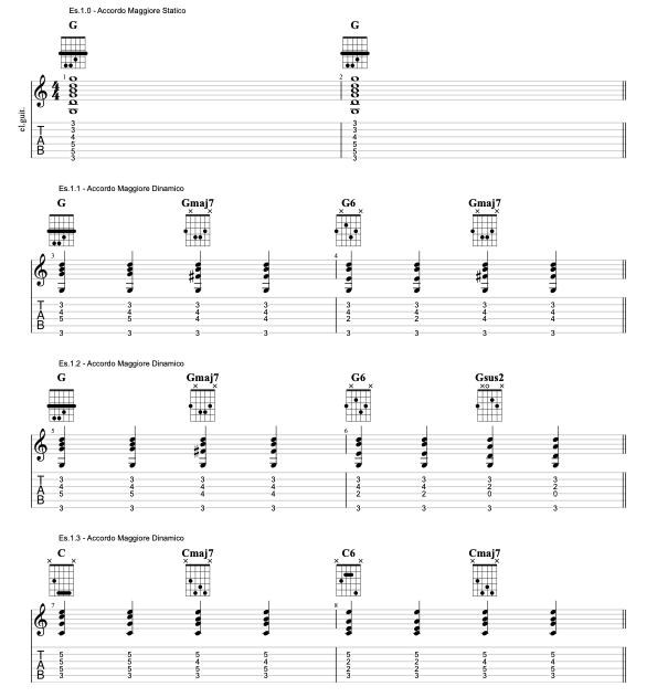 Nel primo blocco di esercizi esploriamo alcune possibili soluzioni sull’accordo maggiore. Muoviamo una delle voci centrali, nello specifico sulla quarta corda, mantenendo altresì inalterati il basso e la nota al canto. Vi invito ad osservare il movimento della voce centrale che mette in evidenza le note SOL (fondamentale dell’accordo), FA# (settima maggiore), MI (sesta maggiore) e RE (quinta giusta).