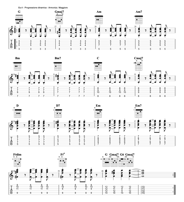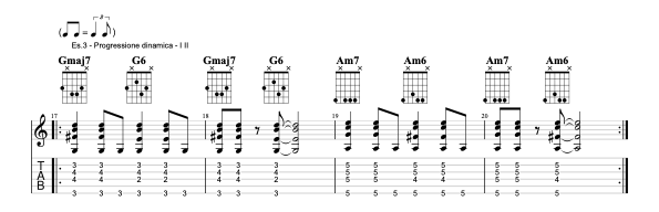 Uniamo adesso le due famiglie di accordi studiate, maggiori e minori, ed eseguiamo una progressione I-II in tonalità di Sol Maggiore (G e Am) alternando i colori della Settima Maggiore e della Sesta Maggiore. Creeremo così un movimento delle voci interne: