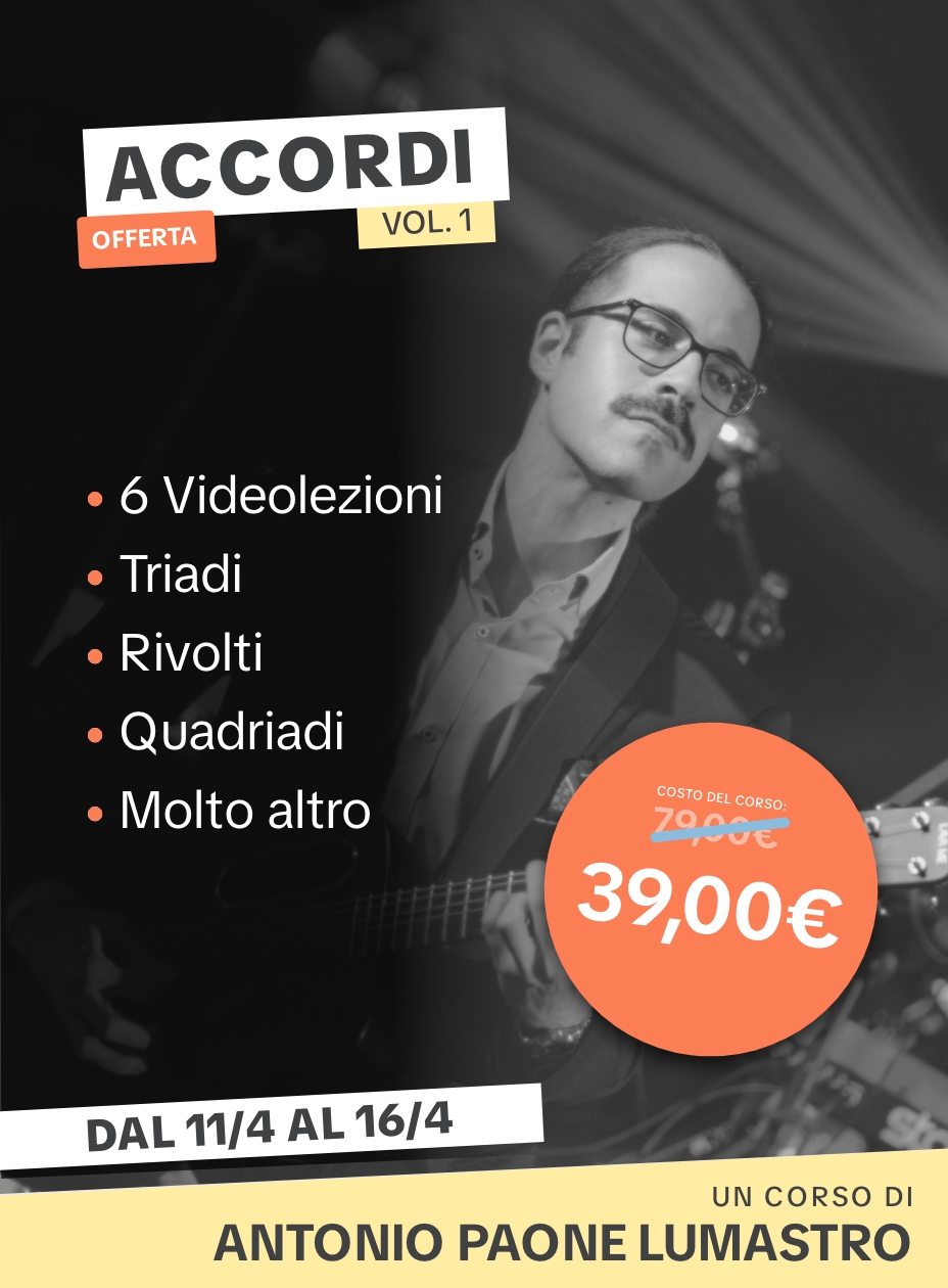 Prima di procedere con gli esercizi, però, voglio ricordarvi che proprio al mondo degli accordi è dedicato il nuovissimo corso Accordi Vol.1 in promozione lancio solo fino a giovedì 16/04/2026. Eccolo qui sotto: