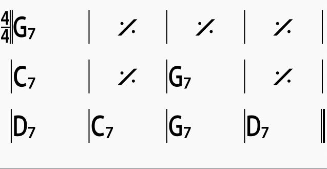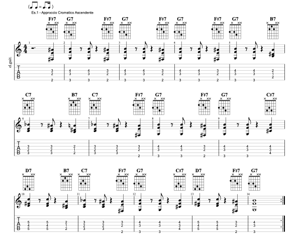 Iniziamo approcciando ciascun accordo della struttura blues con un movimento cromatico ascendente, ovvero partendo un semitono sotto l’accordo target. Dunque il primo grado G7 viene anticipato da un F#7, il quarto grado C7 da un B7, e infine il quinto grado D7 lo si raggiunge attraverso un C#7. È importante notare il dove ritmicamente inseriamo il nostro accordo di passaggio. Negli esempi che vi propongo l’accordo non cade mai sul battere, questo al fine di mantenere una buona stabilità armonica eseguendo l’accordo “corretto” della progressione sui movimenti forti. Notare ancora, alla luce di quanto appena detto, che gli esempi iniziano in anacrusi ovvero la frase parte sul tempo debole della battuta che precede quella di inizio della struttura.