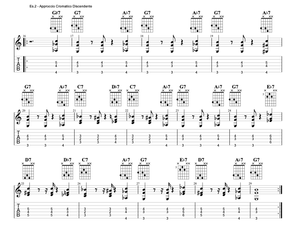Ripetiamo l’esercizio ma questa volta utilizzando l’approccio cromatico discendente, quindi raggiungeremo il nostro accordo target partendo un semitono sopra. Nel caso del nostro primo grado – il G7 – esso sarà anticipato da un Ab7, e così via per gli altri gradi.