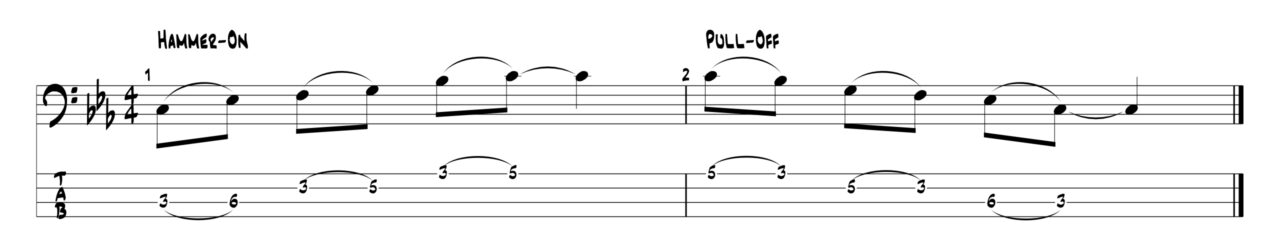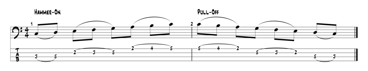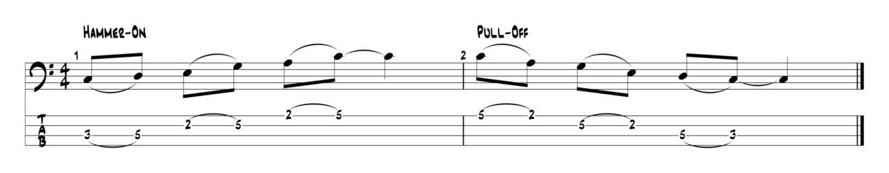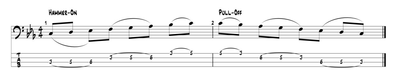 Noterete subito che l’hammer-on risulta molto più semplice rispetto al pull-off. Niente paura, questo accade perché nel movimento ascendente vi basterà premere il tasto per permettere che la corda continui la vibrazione che avete innescato pizzicandola, mentre nel movimento discendente, sollevando semplicemente la mano questa tenderà a smettere di vibrare. Soluzione? Nel pull-off aiutate la vibrazione della corda dando un piccolo strappettino nel cambio di nota.