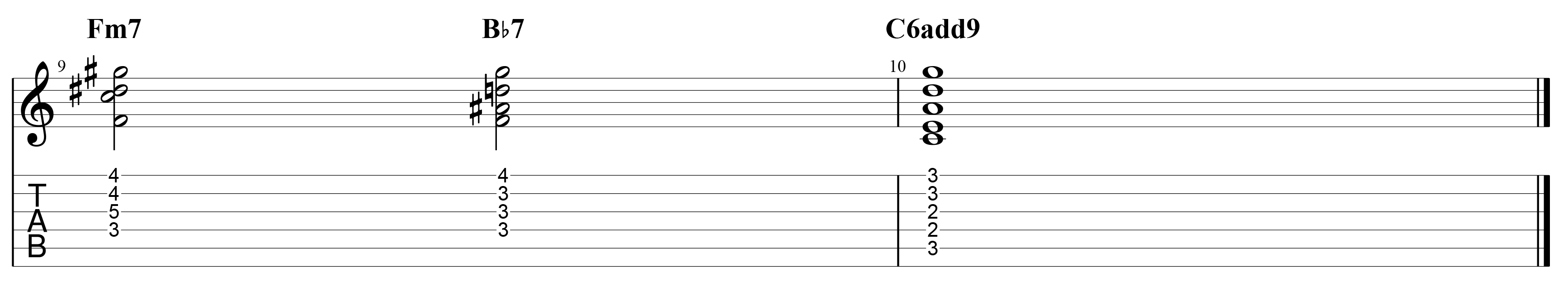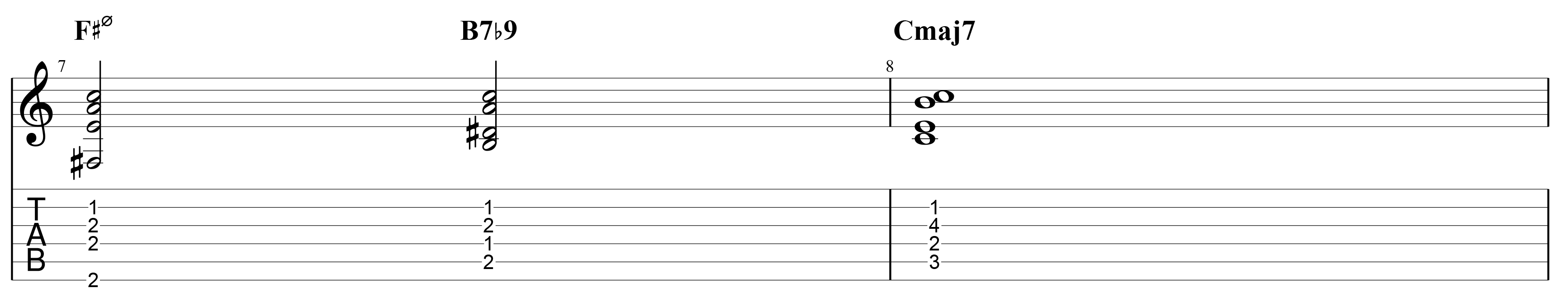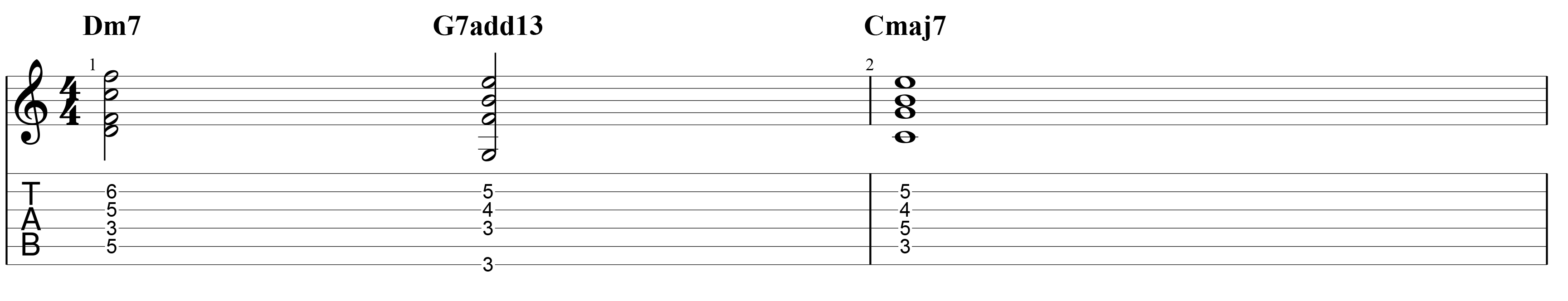 Il primo modo che troviamo per andare a Do maggiore è appunto il classico II – V – I: Dm7 G7 Cmaj7. Nello spartito qui sotto trovi un G7 con l’aggiunta della 13esima ma stiamo pur sempre parlando di un G7 “modificato”.