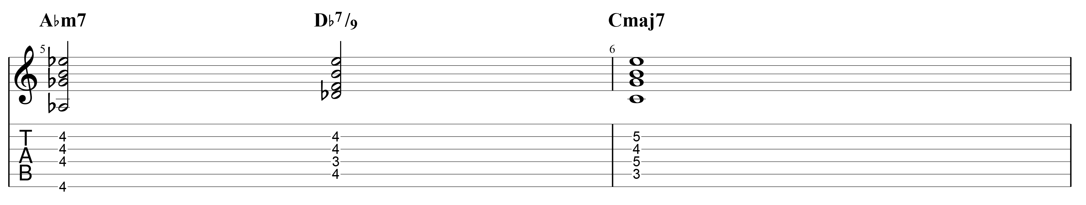 Il tritono non stanca mai un jazzista, quindi perché non sostituire anche il II grado con il suo tritono? Ecco fatto: Abm7 Db7 Cmaj7.