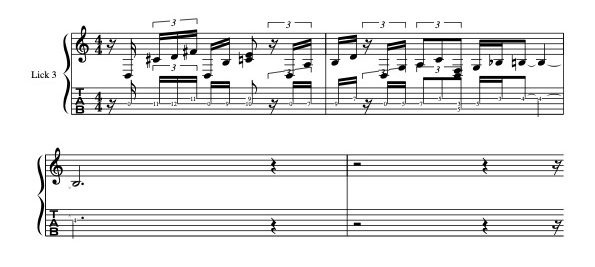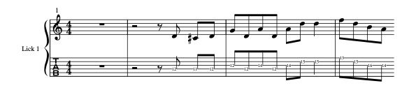 - Verso C: discesa cromatica in double stop, con bending della terza da minore a maggiore per emulare la pedal steel.